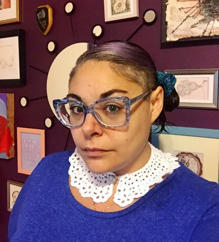 Through a fundamental need to communicate, these works are cathartic in the making. Presenting veiled structures desiring to be enveloped by love, set at a distance, acknowledges the vulnerabilities in an attempt to dissolve barriers creating real meaningful connections. By employing humor as a mechanism to excavate the deep-seated pain to the surface, I am reclaiming power over these emotions. It also gives entry for the viewer, making difficult conversations more palatable. The use of craft materials such as yarn, fabric, and glitter challenges hierarchical Western notions of painting while tapping into a playful sentimentality.